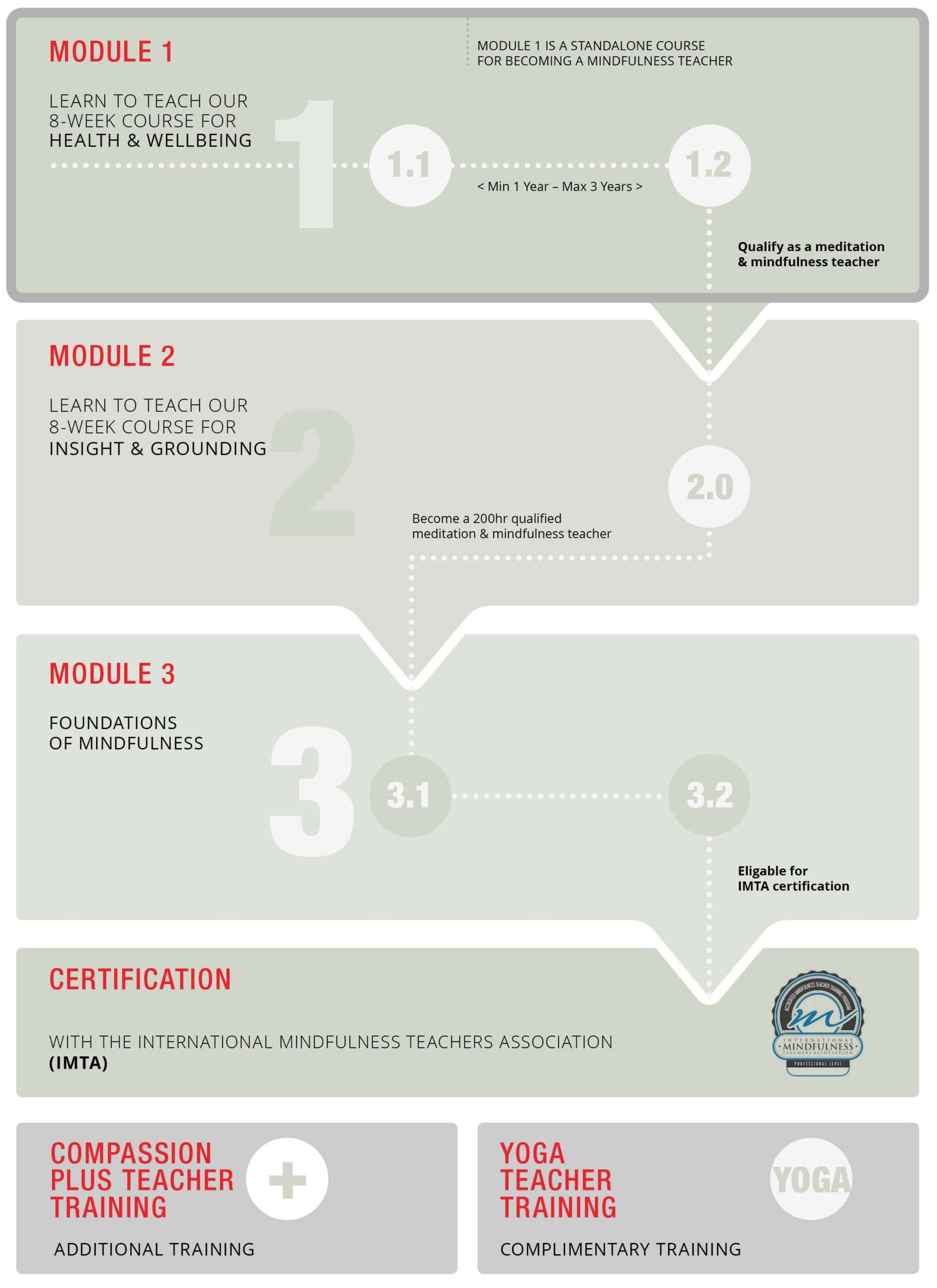 If you decide to undertake all three modules of our Mindfulness Training path you will become a certified teacher with the International Mindfulness Teachers Association (IMTA).